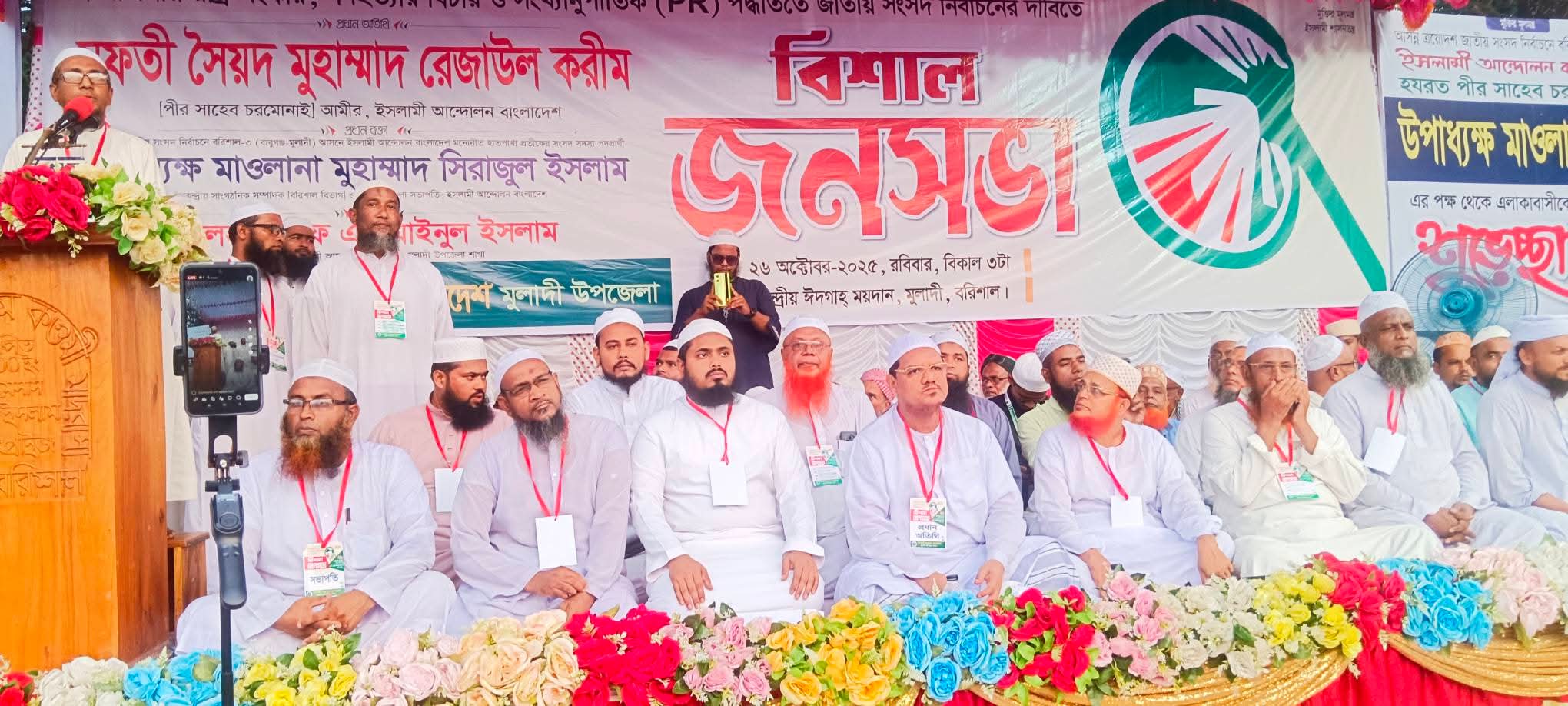 আজ ইসলামী আন্দোলন বাংলাদেশ বরিশাল জেলার আওতাধীন মুলাদী উপজেলা শাখার উদ্যোগে বিশাল জনসভা অনুষ্ঠিত হয়েছে। এতে প্রধান অতিথি হিসেবে গুরুত্বপূর্ণ ভাষণ প্রদান করেন ইসলামী আন্দোলন বাংলাদেশ-এর মুহতারাম আমীর মুফতী সৈয়দ মুহাম্মাদ রেজাউল করীম পীর সাহেব চরমোনাই। বিশেষ অতিথি হিসেবে বক্তব্য রাখেন ইসলামী আন্দোলন বাংলাদেশ-এর সাংগঠনিক সম্পাদক (বরিশাল বিভাগ) ও বরিশাল জেলা সভাপতি উপাধ্যক্ষ মাওলানা মুহাম্মাদ সিরাজুল ইসলাম, কেন্দ্রীয় সহ-প্রচার ও দাওয়াহ সম্পাদক মাওলানা কেএম শরীয়াতুল্লাহ, কেন্দ্রীয় শ্রমিক নেতা হাফেজ মাওলানা ওবায়দুল্লাহ বরকত, বরিশাল জেলা জয়েন্ট সেক্রেটারি মাওলানা মুহাম্মাদ হাফিজুর রহমান, বরিশাল জেলা ইমাম সমিতির সেক্রেটারি উপাধ্যক্ষ মাওলানা ইসমাঈল হোসেন। ইসলামী আন্দোলন বাংলাদেশ মুলাদী উপজেলা সভাপতি আলহাজ্ব এফএম মাইনুল ইসলামের সভাপতিত্বে এবং সেক্রেটারি মাওলানা আবুল কাশেম জিহাদীর সঞ্চালনায় আরো বক্তব্য রাখেন ইসলামী আন্দোলন বাংলাদেশ ও সহযোগী সংগঠনের থানা ও ওয়ার্ড নেতৃবৃন্দ।